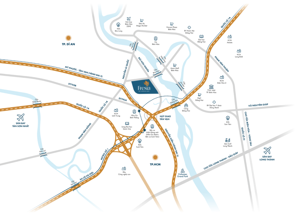 Fresia Riverside tọa lạc tại vị trí đắc địa trên mặt đường Bùi Hữu Nghĩa, hưởng trọn lợi thế từ loạt công trình hạ tầng nghìn tỷ như: Vành Đai 3, tuyến Metro số 1 mở rộng, sân bay quốc tế Long Thành và Trung tâm thương mại Aeon Mall Biên Hòa. Cư dân Fresia Riverside dễ dàng di chuyển giữa “Tam đại đô thị”: TP. Biên Hòa – TP. Dĩ An – TP.Thủ Đức, bắt trọn nhịp sống chuẩn mực khi dễ dàng tận hưởng hàng loạt tiện ích ngoại khu hiện đại.